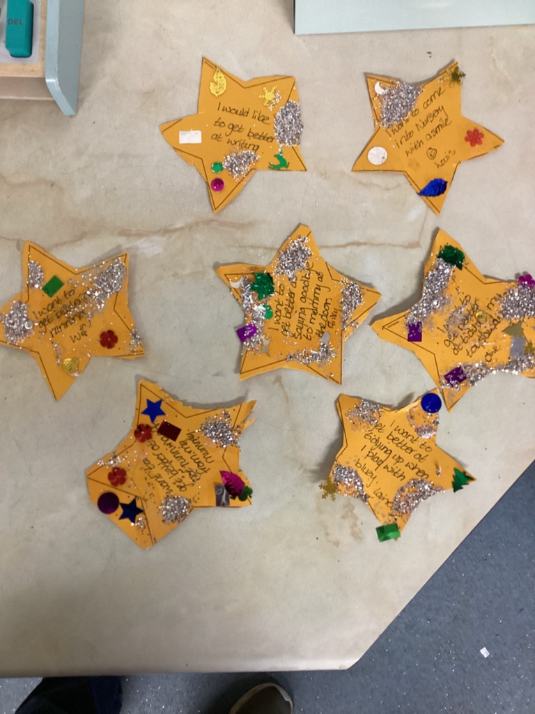 This term the children have been learning about 'what they want to get better at'. We have enjoyed lots of discussions throughout our carpet time with the children giving some great ideas. The children decided their goal and added it to their decorated star. They then attempted to achieve it throughout the week and we celebrated their successes. We have been so impressed with their perseverance and are very proud of the children.