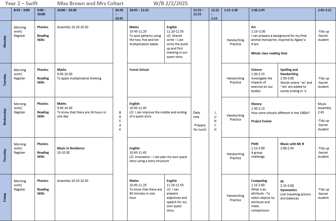 Weekly timetable: