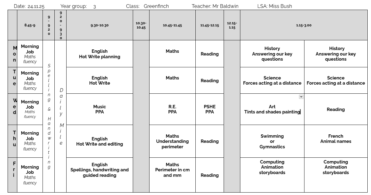 Greenfinch Class Timetable - Week beginning 1st December 2025
