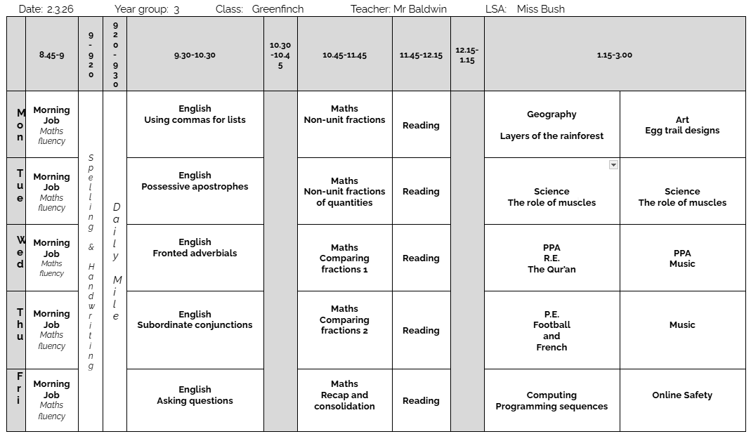 Greenfinch Class Timetable - Week beginning 2nd March 2026