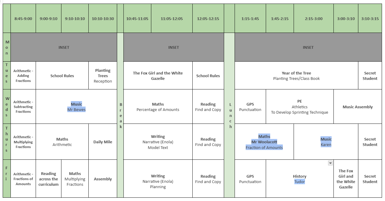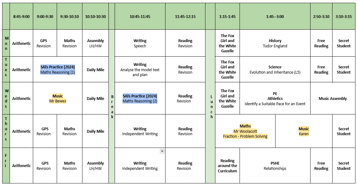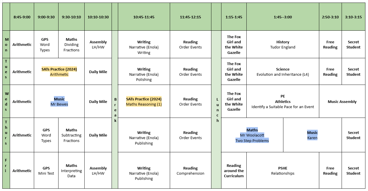 Please see below our week's timetable, uploaded every Friday. To the right, you will find links to everything to do with our class, including: home-learning each week, knowledge organisers linked to our current learning; a growing gallery and news/information.